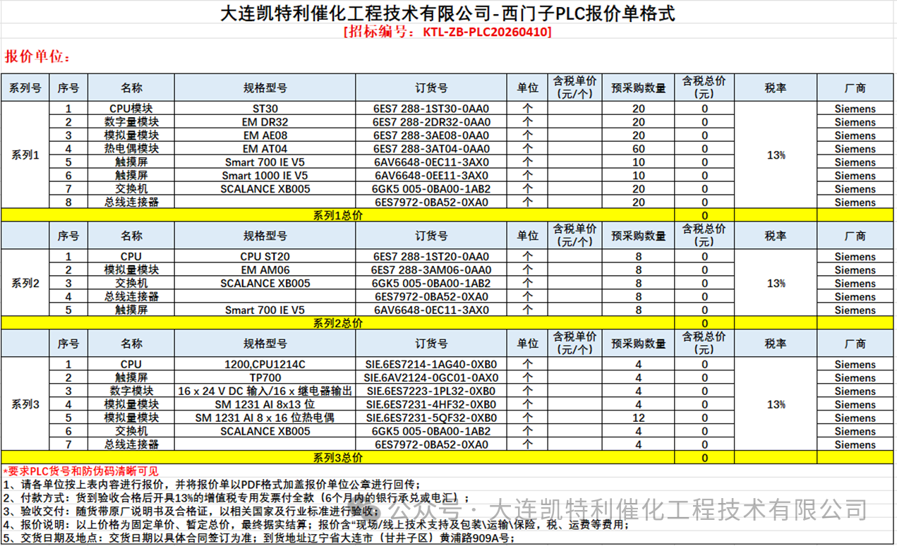 大連凱特利催化工程技術有限公司(以下簡稱“采購人”),現就2026年度設備生產配件-西門子PLC進行框架采購,歡迎符合條件的潛在供貨商積極參與。