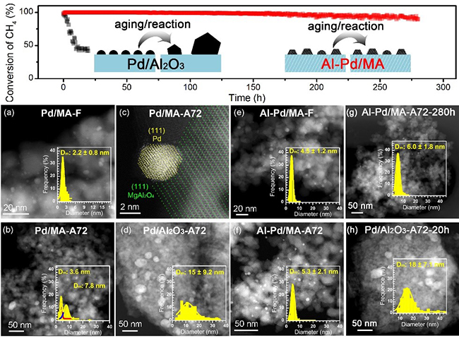 近日,我所催化與新材料研究室李為臻研究員、喬波濤研究員、張濤院士團隊與北京大學馬丁教授合作,在高穩(wěn)定Pd基甲烷燃燒催化劑制備方面取得新進展,以鎂鋁尖晶石(MgAl2O4)為載體,通過添加非還原性氧化物(Al2O3, ZrO2, SiO2)抑制Pd的過度氧化,實現(xiàn)了Pd納米粒子的高水熱穩(wěn)定性。