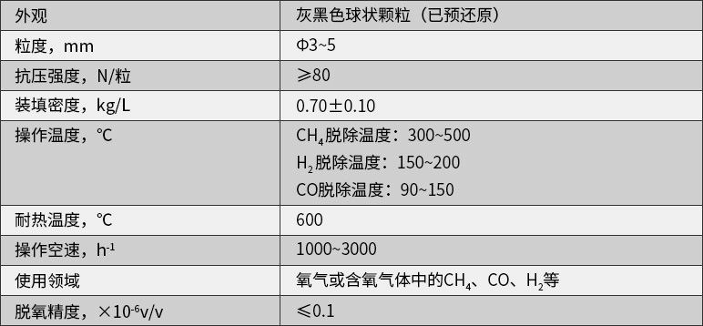 2、CO、輕烴等雜質(zhì)。具有強(qiáng)度好、活性高、脫除雜質(zhì)精度高、耐熱性能好、使用壽命長(zhǎng)、使用溫度低等特點(diǎn)。