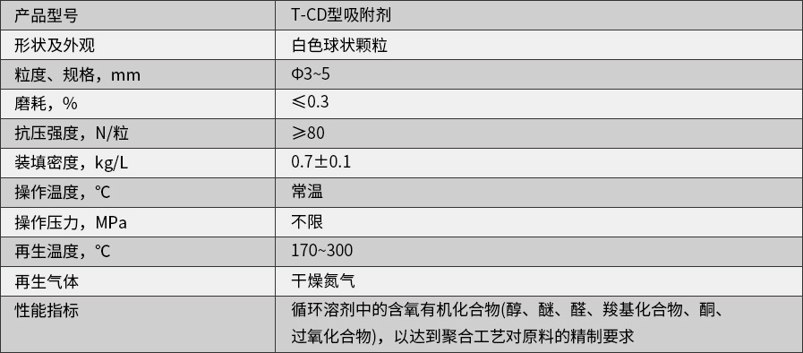 T-CD型吸附劑是一種光滑的球形吸附劑,對(duì)多種極性有機(jī)雜質(zhì)具有優(yōu)越的吸附性能,如:醇、醛、酮、醚、過氧化物、乙二醇等含氧化合物;硫醇;含氮化合物(氨氣、胺、腈)。該吸附劑具有階梯型多樣孔道結(jié)構(gòu),在保證高吸附容量的同時(shí)能加快吸附脫附速率,減少吸附傳質(zhì)阻力;其表面活性低,吸附時(shí)具有低熱效應(yīng)。