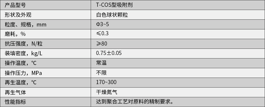 T-COS型吸附劑是一種光滑的吸附劑,它的特殊性能主要表現(xiàn)在可以選擇性吸附來自于碳氫化合物氣體中的COS、CO2和H2S。用于聚丙烯、乙烯以及催化重整過程中,具有很好的吸附能力,是一種能保護和增強催化劑壽命的吸附劑。